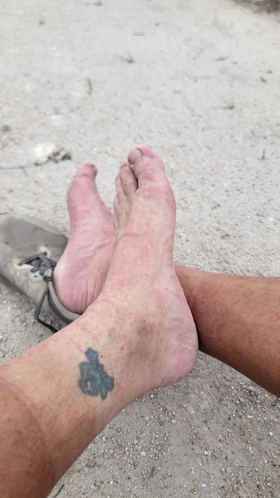 I carry three pairs of socks. I haven’t done laundry since I started this trip. I used a fresh pair at some point after departing the keys. I switched back and forth between these two pairs in the swamp area, doing the best I could. Anyways, I put on my last pair of machine washed socks to help my feet. The benefits won’t take long to feel.