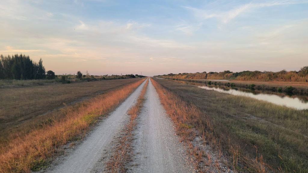 The trail crosses the Tamiami Trail (Highway 41) to be on its north side. It’s quite a busy road and under construction. The trail crosses a canal that’s north of the road and travels west in a straight line for some time.