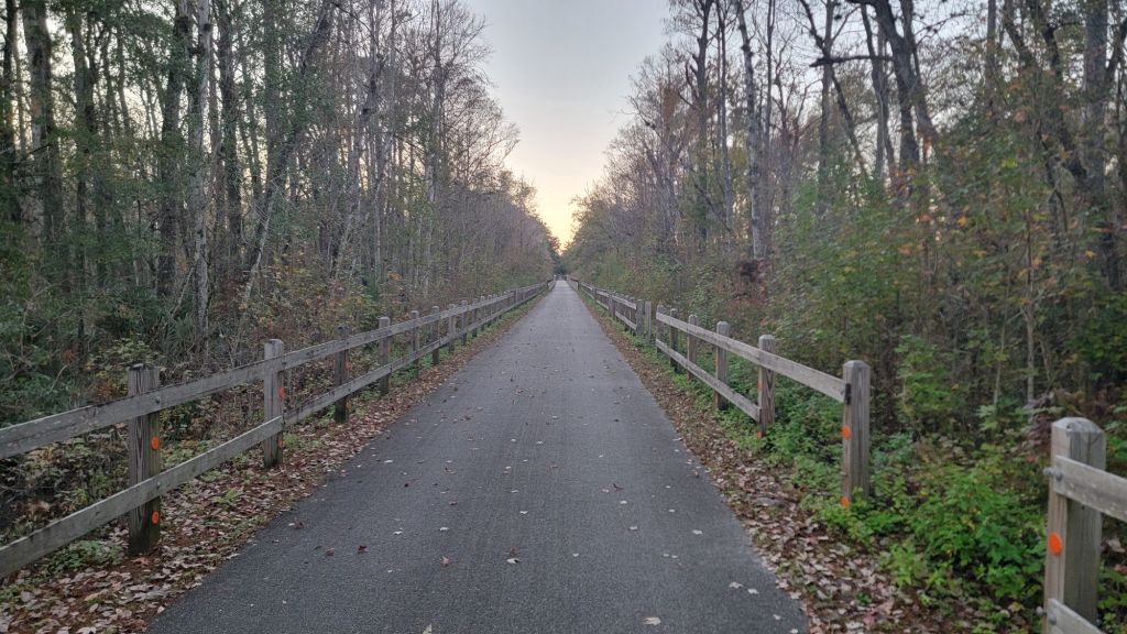 The trail is quite lovely. I’m in a great mood. As the sun goes down and things get dark on a rails, the trail’s bike path for a few miles.